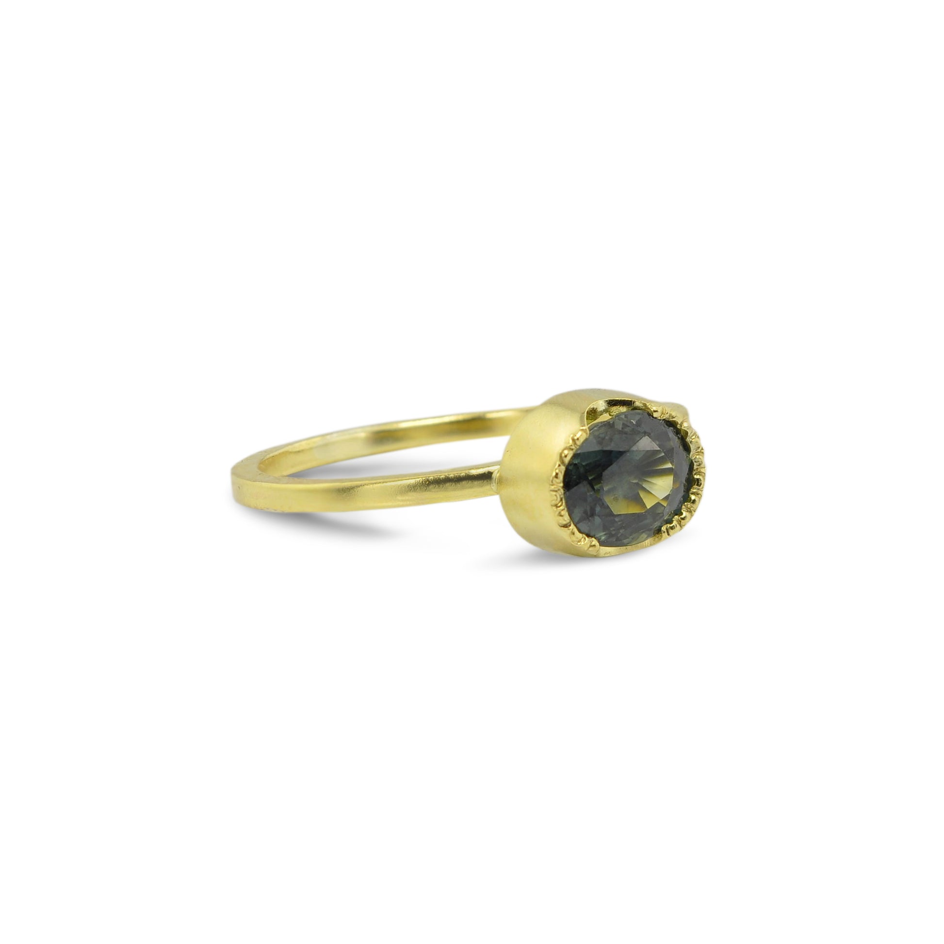 When the light hits this oval-cut green sapphire just right, hues of forest green mixed with deep aqua jump out at you. The Coniferous Sapphire Ring will put you deep in the forest, smelling the earthy greens of pines. It is perfect for every day wear – comfortable and easy.